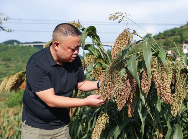 粮站管理人员段关伟在查看高粱长势,做好收购准备