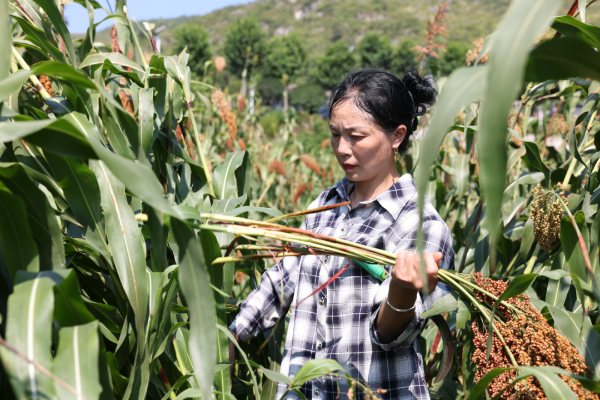 正在收割高粱的周伦芳